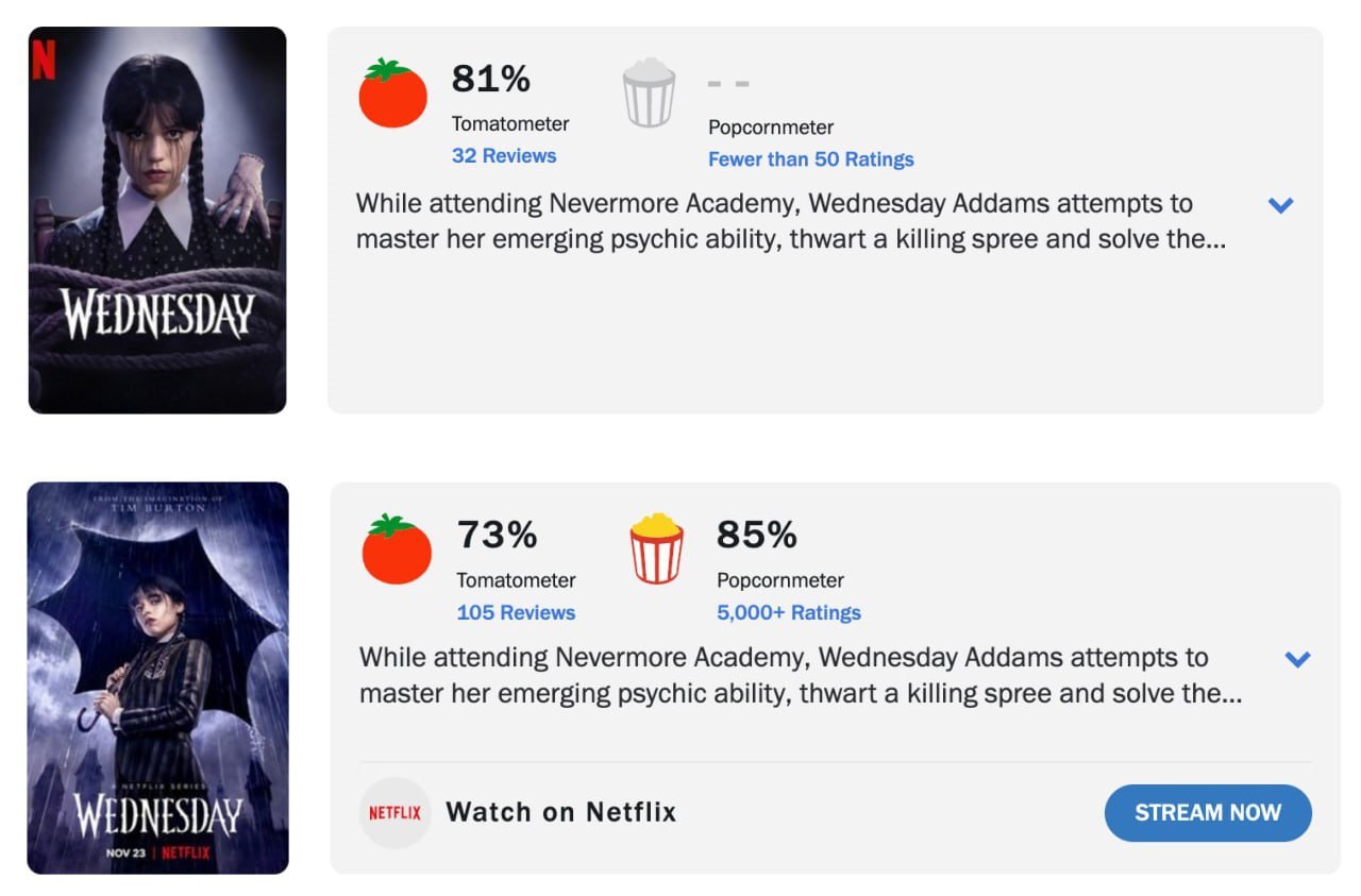 Первая часть второго сезона хитового сериала Netflix "Уэнсдей" с Дженной Ортегой в главной роли уже вышла 6 августа и сразу собрала одобрительные отзывы критиков. Трамвай узнал, что новый сезон получил 81% "свежести" на Rotten Tomatoes против 73% у первого сезона.