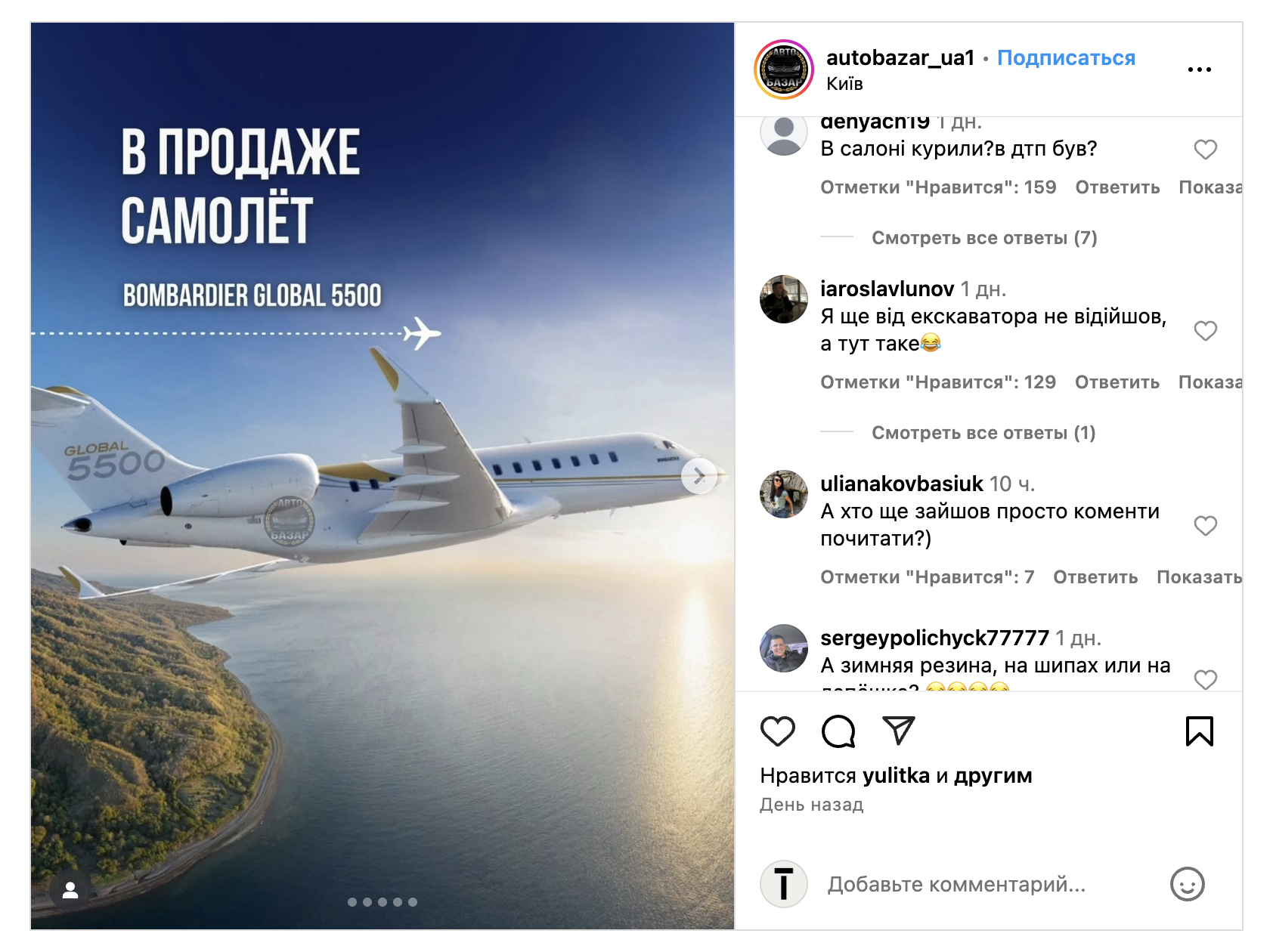 В столиці з'явилося незвичайне оголошення про продаж приватного літака Bombardier Global 5500 2020 року випуску за майже 40 мільйонів доларів. Трамвай з'ясував, що бізнес-джет пропонують купити через популярний автомобільний маркетплейс, де зазвичай продають машини та мотоцикли.