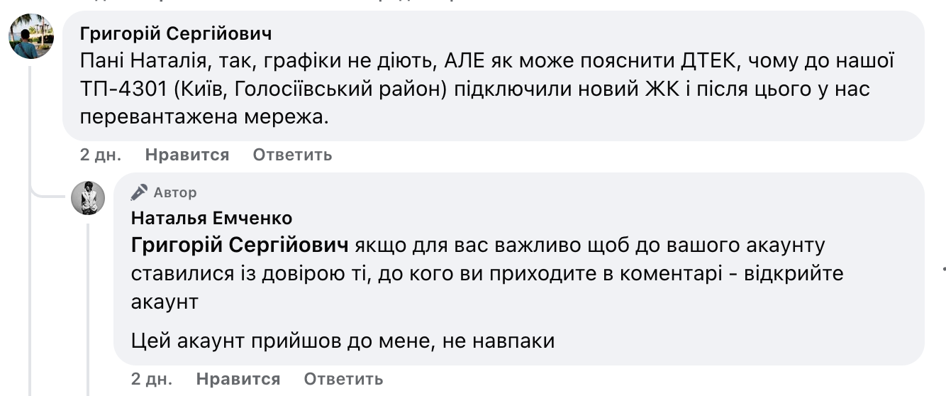 Наталія Ємченко, директорка з комунікацій SCM та представниця групи ДТЕК, відмовилася спілкуватися у Facebook з киянином, який запитував про проблеми з електропостачанням.