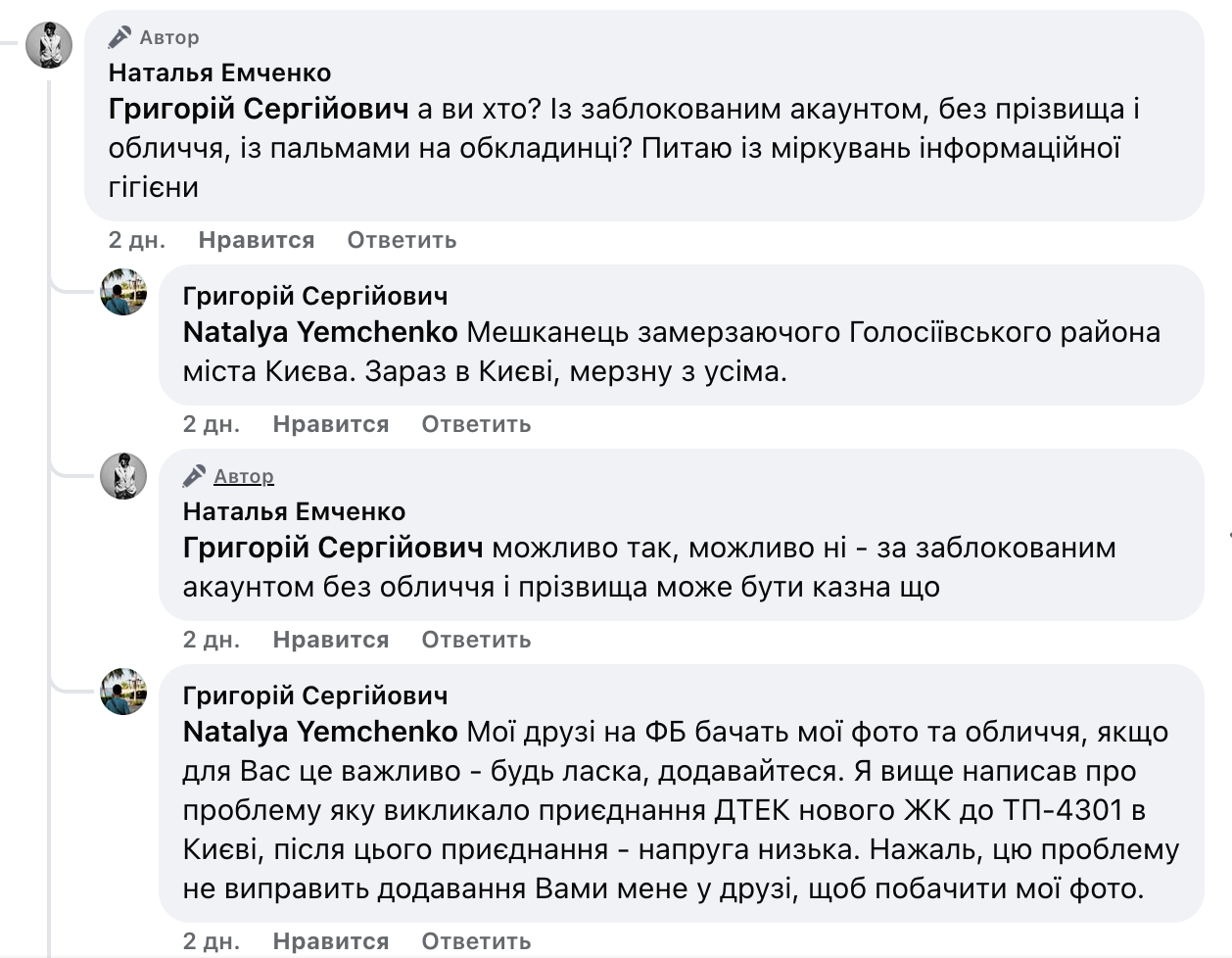 Користувач відповів, що він мешканець Голосіївського району, зараз перебуває в Києві і "мерзне з усіма". Ємченко у відповідь написала: "Можливо так, можливо ні - за заблокованим акаунтом без обличчя і прізвища може бути казна що".