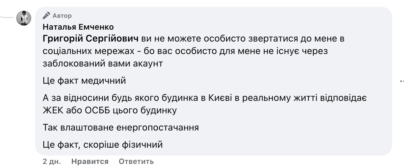 Надалі Ємченко повідомила, що не відповідатиме на питання користувача: "Ви не можете особисто звертатися до мене в соціальних мережах - бо вас особисто для мене не існує через заблокований вами акаунт. Це факт медичний". При цьому вона додала: "А за відносини будь-якого будинка в Києві в реальному житті відповідає ЖЕК або ОСББ цього будинку. Так влаштоване енергопостачання. Це факт, скоріше фізичний".