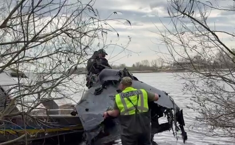 Поліцейські вилучили з річки Дніпро в Голосіївському районі Києва ворожий безпілотник з бойовою частиною, який, імовірно, упав у воду під час масованої атаки на Київ уночі 16 квітня.